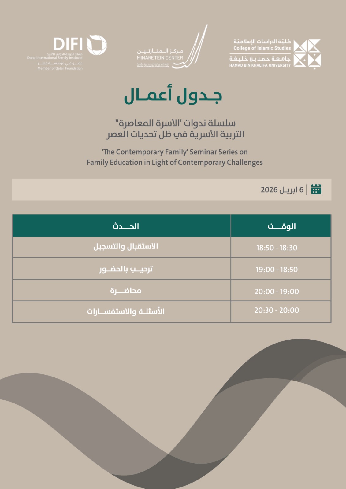 يدعوكم معهد الدوحة الدولي للأسرة، بالتعاون مع مركز المنارتين وكلية الدراسات الإسلامية بجامعة حمد بن خليفة، لحضور جلسة ضمن سلسلة ندوات «الأسرة المعاصرة»، والتي تتناول التربية الأسرية وكيفية تفاعل الأسرة مع تحديات العصر من خلال طرح يجمع بين البعد الأكاديمي والسياساتي وخبرة قطاع التعليم.