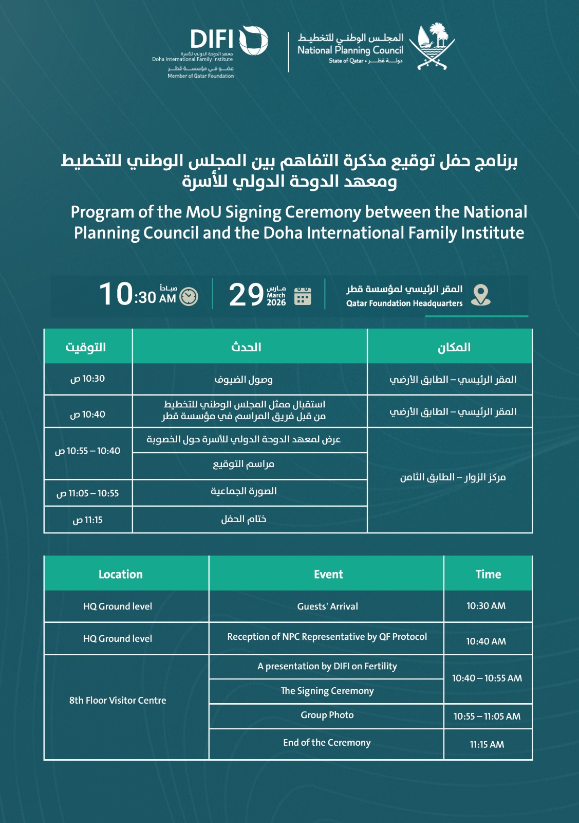 Doha International Family Institute is organizing a signing ceremony with National Planning Council to formally sign a Memorandum of Understanding between both parties. The ceremony will include guest arrivals, a presentation by DIFI on fertility, the signing of the agreement, and a group photo for the signatories.