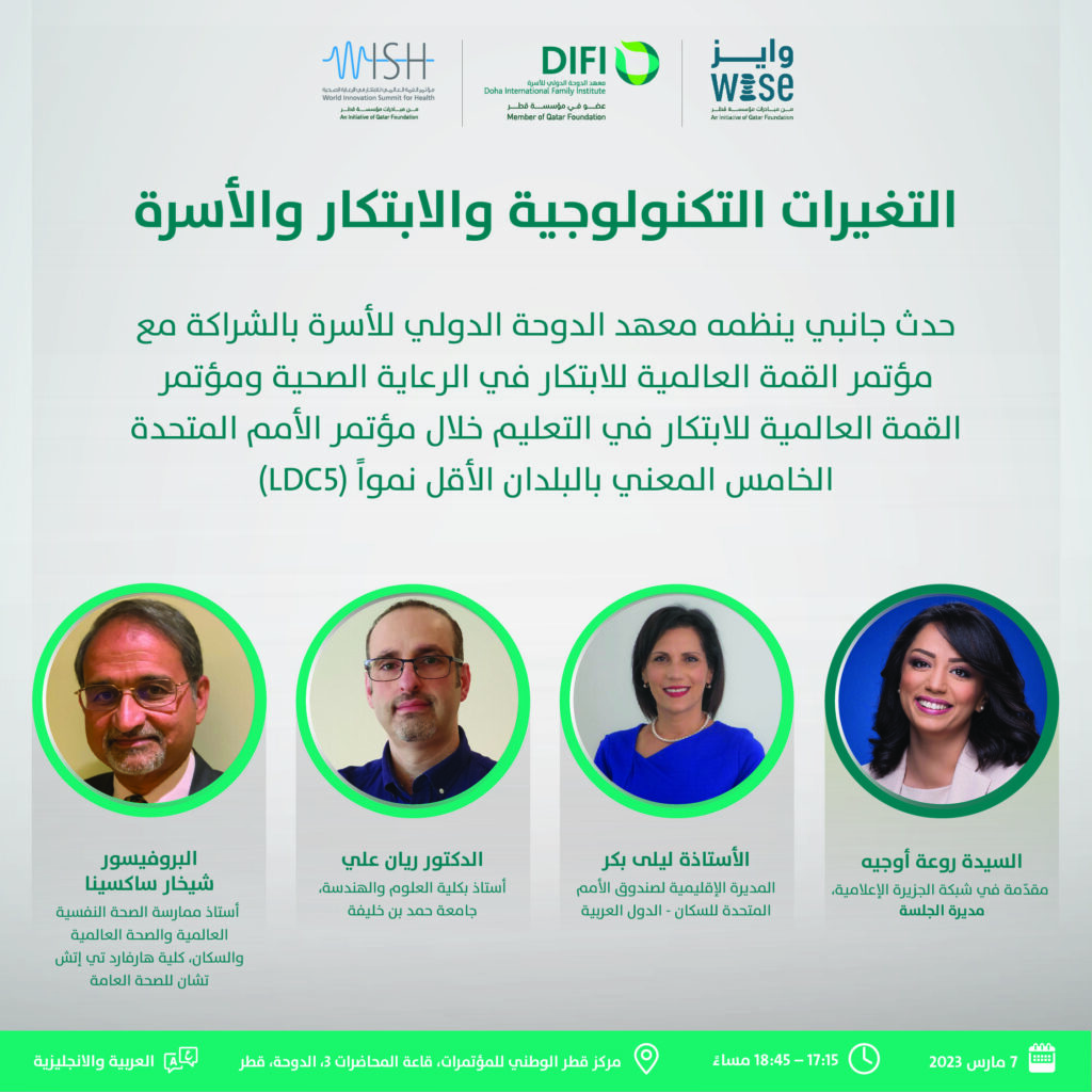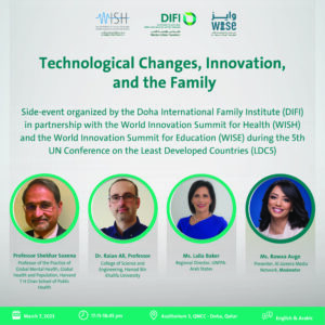 The Doha International Family Institute (DIFI) in partnership with World Innovation Summit for Health (WISH) and World Innovation Summit for Education (WISE) organized a side event titled “Technological Changes, Innovation, and the Family during the 5th UN Conference on the Least Developed Countries (LDC5), The panel discussion was participated by Ms. Laila Baker, Regional Director, UNFPA-Arab States , Dr. Raian Ali, Professor, College of Science and Engineering, Hamad Bin Khalifa University, Professor Shekhar Saxena, Professor of the Practice of Global Mental Health, Global Health and Population, Harvard T H Chan School of Public Health, and the session was moderated by Ms. Rawaa Auge, Presenter, Al Jazeera Media Network .